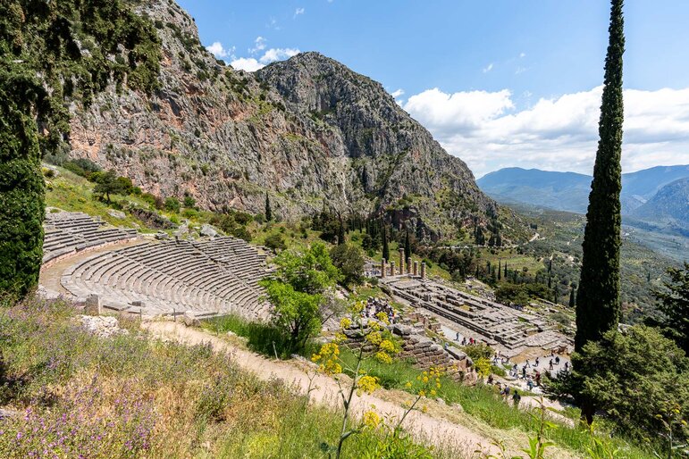Delphi was built into a hillside and you’ll start at the bottom of the site, walking up the pathways between the remains of important buildings, with the theatre and then the stadium towards the top.