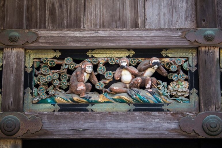This rather unassuming wood carving at a temple in the Japanese town of Nikko has a lot to answer for. It wasnโt meant to be anything special โ itโs one of eight carvings that are meant to represent the cycle of man โ but this is the image which has spawned all the others youโve ever seen.