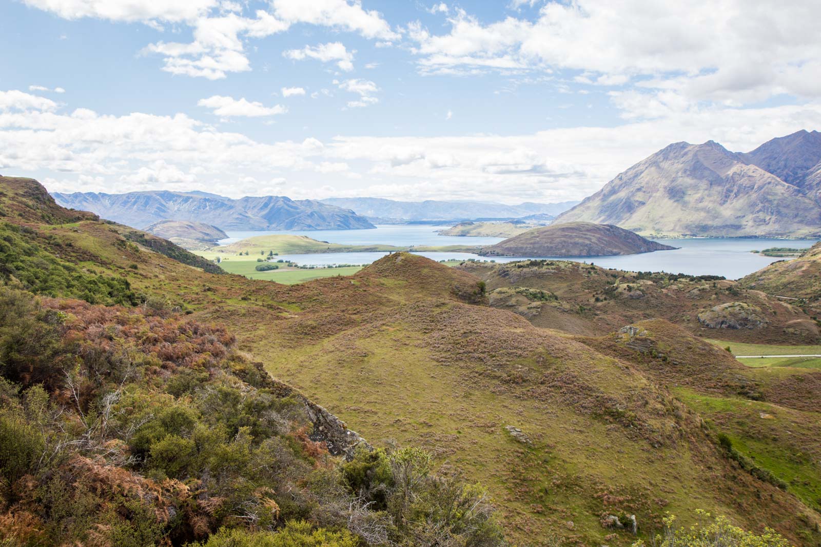 On the way up, the vista spreading out below me is of Lake Wanaka, bright blue and fresh. A couple of little islands break up the water and the coastline winds around so that green intersects at various points.