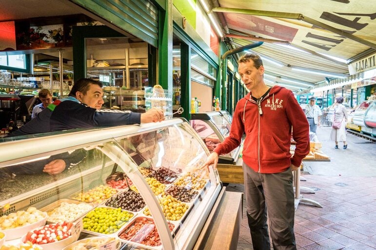 Andreas Mahl stops suddenly as we’re walking through the market. He’s spotted a big bowl of olives that he likes the look of. He smiles at the owner of the stall and asks if he and I can try one. Sure, he says, handing them over. They’re fantastic, he tells me. I nod in agreement – they are pretty good.